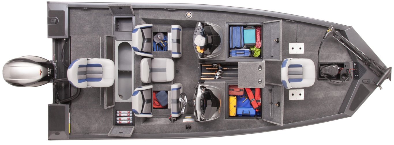 Divided aerated 33 gallon live well has 800 gallons per hour recirculation system with timer and pump out. Easy access to the stern when the center seat is folded down. |