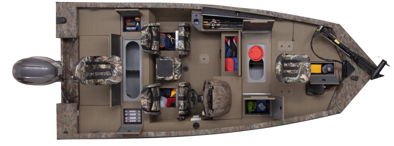 The spacious layout, with a beam of 92”, allows freedom of movement; the front deck alone has over 33 sq. ft. of casting platform. Two high back fishing seats can be positioned side by side when the best Crappie hot spot is located. |