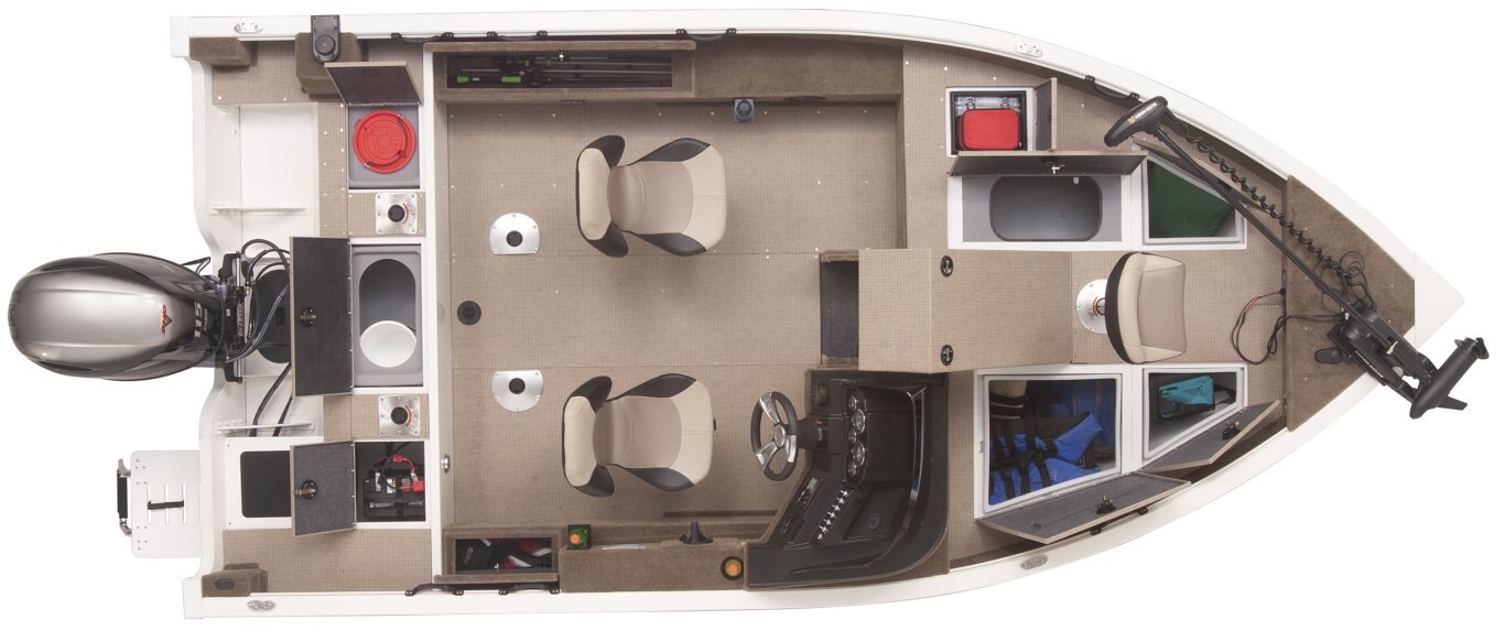 TWO livewells, bow (35g.) and stern (15g.), provide 50 gallons of fresh, aerated water. Stern livewell also includes bait bucket insert. |