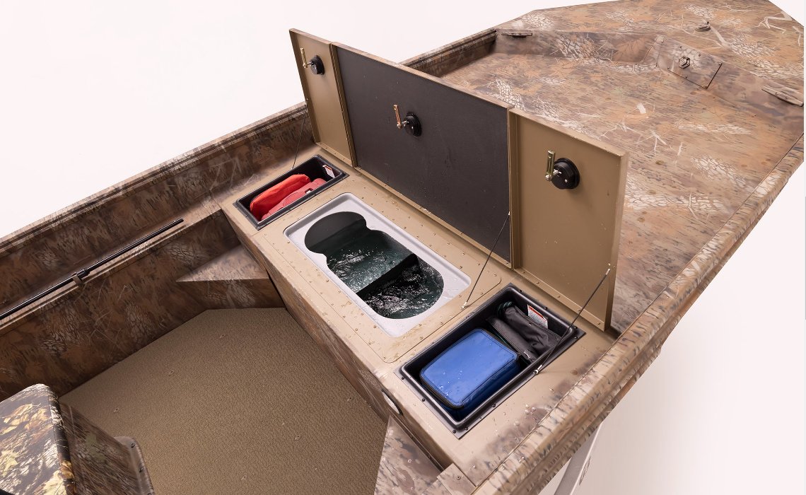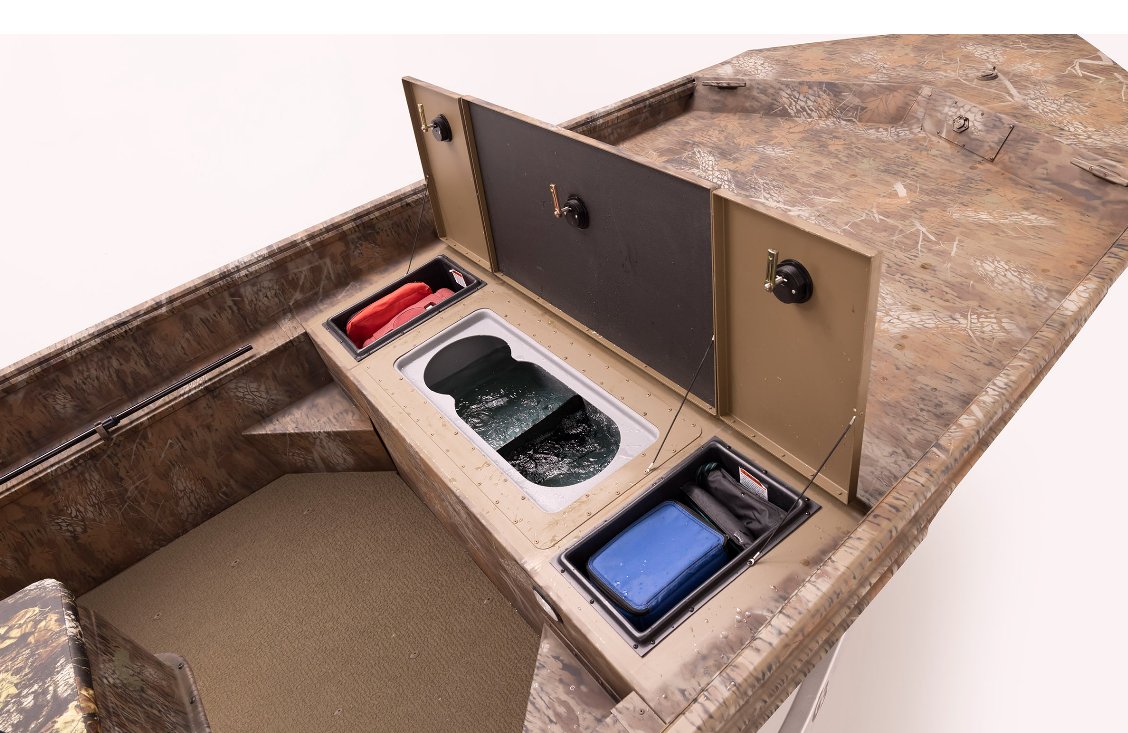 The bow livewell has insulated lid that helps keep your catch fresh all day. Storage boxes are located on either side. |