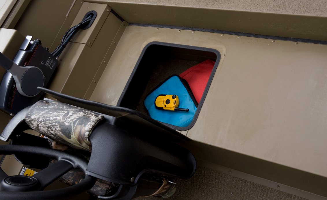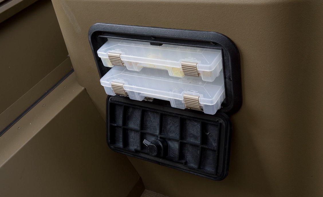 Front side of console houses tackle trays for quick access and easy organization. Tackle trays included. |