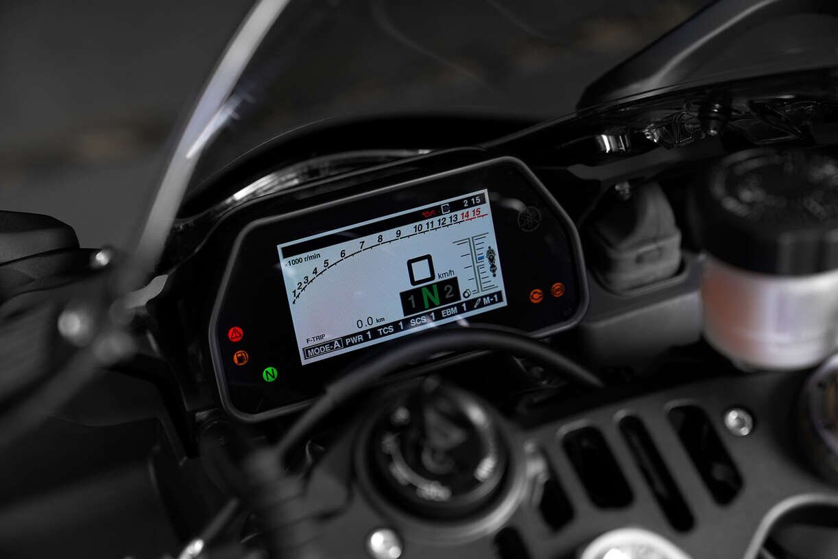 • street display mode functions include; speedo, bar-style tach, odometer, dual trip meters, gear position, intake air temp, coolant temp, instant and average fuel efficiency, clock, fuel consumed, fuel trip meter (appears when fuel switches to reverse - 3 litres remaining), peak rpm indicator, front brake pressure indicator, acceleration indicator, lap timer, ERS indicator and selected YRC setting info